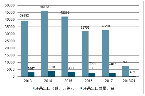 2013-2018年Q1我国塔吊出口数量及金额情况
