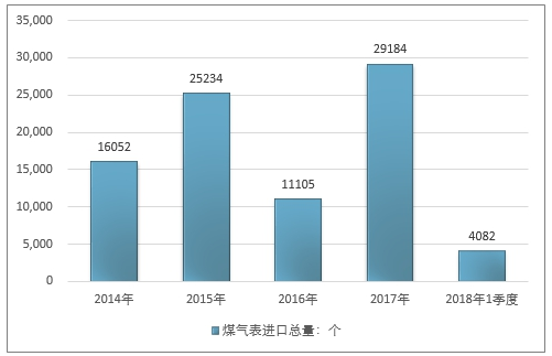 2016年我国煤气表进口总量11105个 ,2017年进口总量29184个 ;2019年1季度进口总量4082个 。