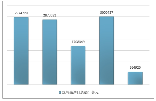 2016年我国煤气表进口总额1708349美元,2017年进口总额3000737美元;2019年1季度进口总额564920美元。