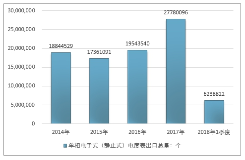 2016年我国单相电子式(静止式)电度表出口总量19543540个 ,2017年出口总量27780096个 ;2019年1季度出口总量6238822个 。
