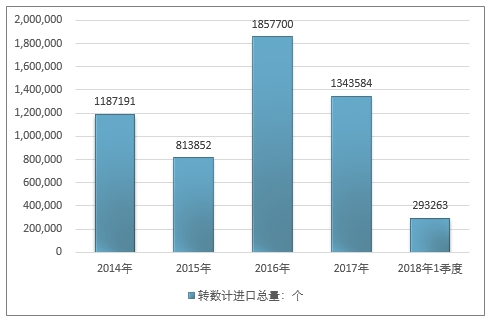 2016年我国转数计进口总量1857700个 ,2017年进口总量1343584个 ;2019年1季度进口总量293263个 。