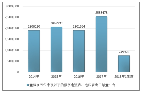 2016年我国量程在五位半及以下的数字电流表、电压表出口总量1901664台 ,2017年出口总量2538473台 ;2019年1季度出口总量749920台 。
