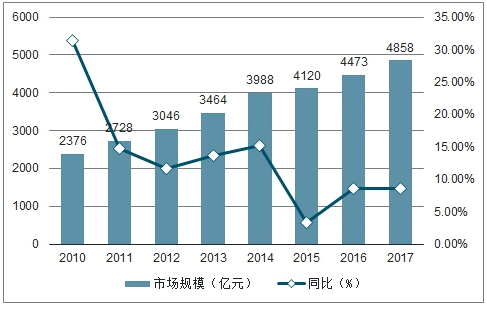 2010-2017年中国照明行业市场规模及同比增长走势