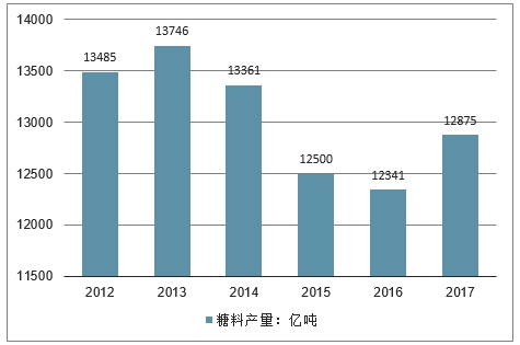 2013-2016年中国糖料产量逐年下降,2016年糖料产量1.23亿吨;2017年,中国糖料产量1.28亿吨。
