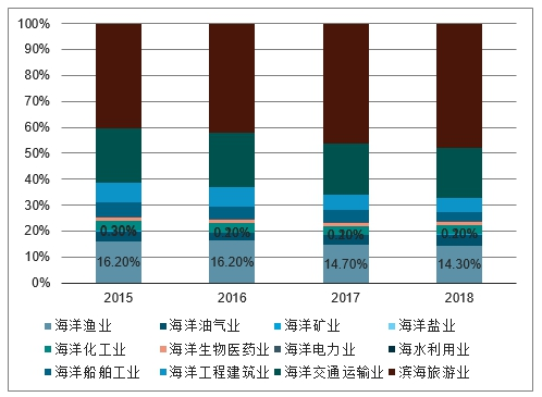 2019年我国海洋经济一二三产业比重为稳定在4.4:37:58.6。就当前我国主要海洋产业发展状况来看,我国海洋第三产业比重可能将进一步提升,特别是滨海旅游业占比将逐年提升。
