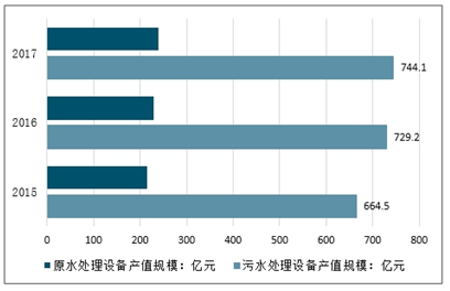 2017年我国水处理设备行业产值达到982.3亿元,其中污水处理设备产值为744.1亿元,原水处理设备产值为238.2亿元。