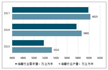 2017年,我国油罐行业产量约6025万立方米,同比2016年的5865万立方米增长了2.73%。 2017年我国油罐行业消费量5985.6万立方米,同比2016年的5770.6万立方米增长了3.73%。