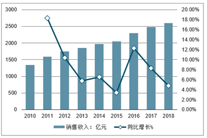 2010-2018年中国连接器制造行业销售收入及同比增长走势