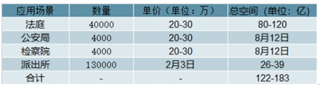 目前全国有3525个法院,一个典型的基层法院(以区法院为例)内设机构共有20个部门(分别为刑庭、少年庭、民一庭、民二庭、民三庭、民四庭、知识产权庭、行政庭、执行一庭、执行二庭、执行局综合科、立案一庭、立案二庭、审监庭、政治处、监察室、办公室、研究室、审判管理办公室及法警大队)。据此测算,全国共有40000多个法庭。根据统计,全国派出所及相关警务室共有13万个,公安局和检察院等机构则可由全国行政区划估算,目前全国县级以上的行政区共3218个,另外还有铁路公安、森林公安、民航公安等,由此估计公安局加上检察院数量应该不少于8000个。作为公检法系统,都要求透明,留痕,因此都有语音技术的需求。