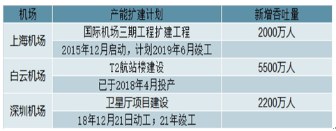 2019年上海机场的实际旅客吞吐量7400万人已经超过原设计旅客吞吐量6000万人;白云机场实际旅客吞吐量6970万人远远超过原设计旅客吞吐量3500万人;深圳机场实际旅客吞吐量为4930万人也已超过原设计旅客容量4500万人。强需求倒逼产能扩充,各机场已积极做出应对政策,进行产能扩建,上市机场均已进入新一轮产能投放周期,未来需求端的限制将得到有效缓解,保障航空性业务维持稳健增长。