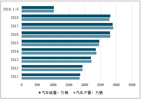 2011-2019年5月汽车产销量走势