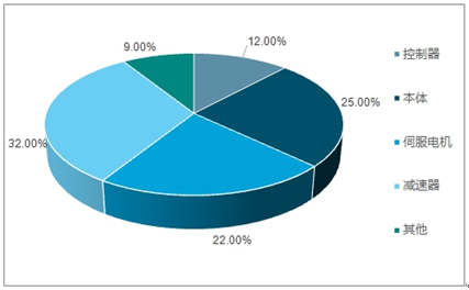 整体来看, 工业机器人的总成本中,核心零部件的比例接近70%,其中减速器、伺服电机和控制器占比分别为32%、 22%和12%。