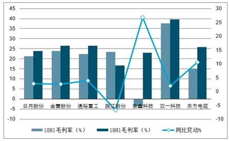风电行业零部件2018-2019年半年度毛利率对比