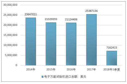 2016年我国电子万能试验机进口总额21124406美元,2017年进口总额25387134美元;2018年1季度进口总额7162415美元。