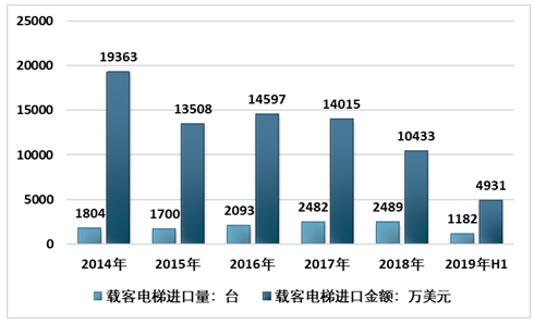 2014-2019年上半年中国载客电梯进口量及金额统计