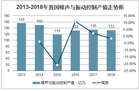 2013-2018年我国噪声与振动控制产值走势图