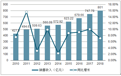 2010-2018年中国传感器制造行业销售收入总额及增速
