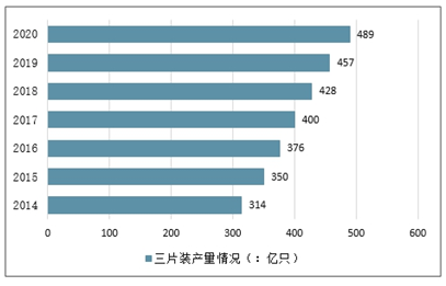 2014-2020年中国三片装行业产量情况(单位:亿只)