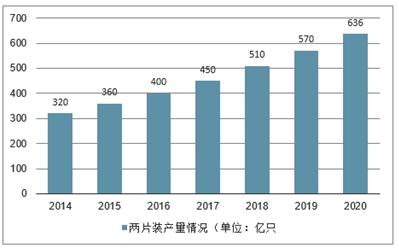 2014-2020年中国两片装行业产量情况(单位:亿只)