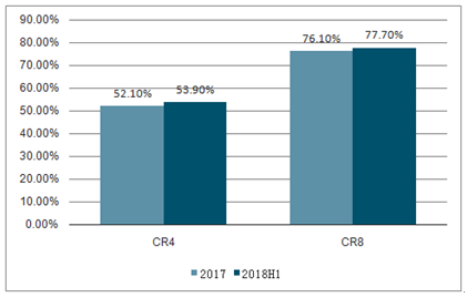 国内挖掘机械行业正逐步转入高市场集中度行业。2017年国内市场集中度CR4为52.1%,CR8为76.1%。2018年国内挖掘机械市场集中度CR4为53.9%,CR8为77.7%,集中度逐步提高