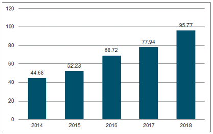我国质谱仪进口金额整体呈现逐年增加的趋势,自2014年的44.68亿元增加至2018年的96.77亿元,年均复合增长率达21.00%。