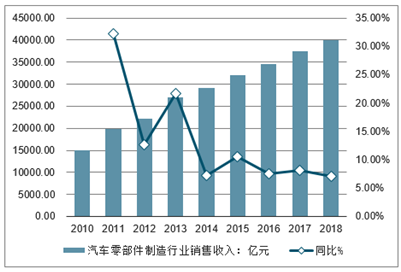 2010-2018年中国汽车零部件制造行业销售收入及增长(单位:亿元,%)