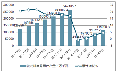 2017-2018年各月发动机累计产量及增长走势