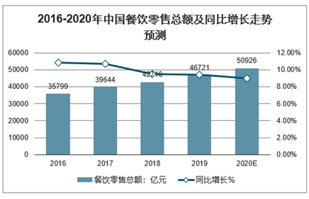 2016-2020年中国餐饮零售总额及同比增长走势预测