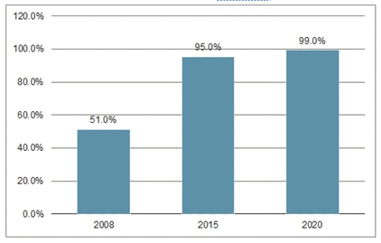 中国乳制品行业在现代化进程中已取得长足进步。政府颁布的各项政策已经将通过机械化挤奶获得的牛奶比例从2008年的51%提高到2015年的95%且规模奶牛养殖场达到100%。中国规模化养殖场实现100%机械化挤奶。全混合日粮饲养技术(TMR)普及率是行业现代化的另一个标志。中国规模奶牛养殖场TMR普及率的比例从2008年的30%上升至2018年的超过90%。