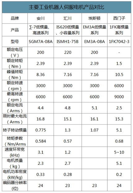 对比国内外主要伺服电机产品,我国伺服电机与日系和欧美品牌相比仍然存在不足,具体表现为快速响应性、功率密度、稳定性和工作精度等指标差距较大,电机的惯量、电流、扭矩输出等参数往往不能做到最优化,国产机器人为了满足最大负载和速度参数,使用的电机都比日系选型要大,负载自重比大。