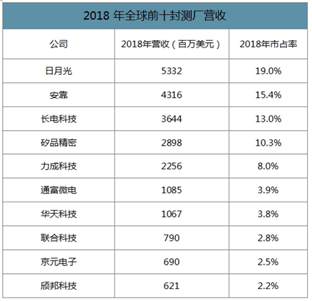 2018年全球前十封测厂营收
