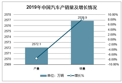 2019年中国汽车产量完成2572.1万辆,下降7.5%;销量2576.9万辆下降8.2%,产销量降幅比上年分别扩大3.3和5.4个百分点。