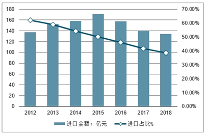 2018年我国汽车焊装设备进口金额约为134.25亿元,国内焊装设备进口依存度从2012年的62.2%下降至2018年的38.5%。