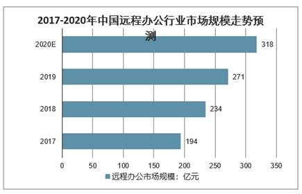 随着远程办公行业信息化建设不断提升,企业对远程办公应用及设备的需求也持续增长,我国远程办公市场规模也保持高速增长趋势。2017年,我国远程办公市场规模为194亿元左右,2018年达到234亿元左右,同比增长20.8%;预计2019年中国智能移动办公行业市场规模为271亿元左右,2020年将增长至318亿元。