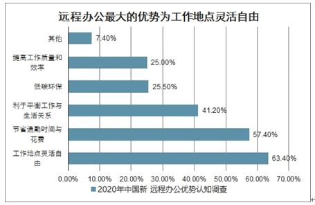 在用户调研中,结果显示63.4%的受访用户认为远程办公的优势在于工作地点灵活自由,57.4%受访用户认为远程办公节省了通勤时间与花费。