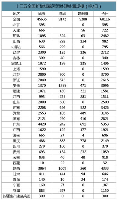 2017年1月,国家发展改革委会同住房城乡建设部编制了《“十三五”全国城镇污水处理及再生利用设施建设规划》,规划中明确提出“十三五”期间城镇污水处理及再生利用设施建设共投资约5644亿元,其中新增或改造污泥无害化处理处置设施投资294亿元,新增或改造污泥(按含水率80%的湿污泥计)无害化处理处置设施能力6.01万吨/日。其中,设市城市4.56万吨/日,县城0.92万吨/日,建制镇0.53万吨/日。提出到2020年底,地级及以上城市污泥无害化处置率达到90%,其他城市达到75%;县城力争达到60%;重点镇提高5个百分点,初步实现建制镇污泥统筹集中处理处置的发展目标。除全国外,十三五期间各省都对城镇污泥处理处置规模进行一定上调,各省合计污泥处理处置规模达到6.01万吨/日。各省份具体来看,广东省新增城镇污泥处理处置规模最大,十三五期间将新增5353吨/日,城、县、镇分别增加4220吨/日、242吨/日、691吨/日。