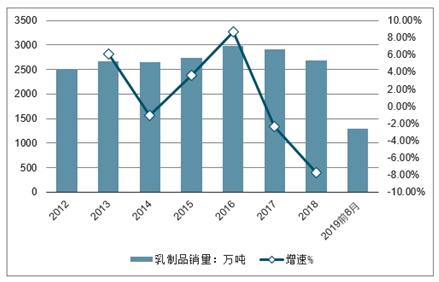 2012-2019年H1中国乳制品销量及增长情况
