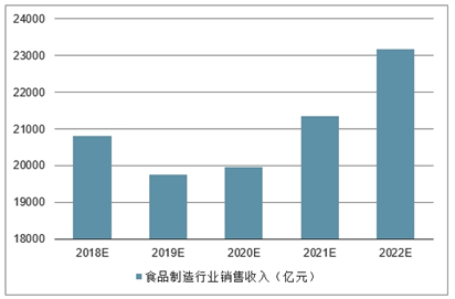 2018年我国食品制造行业销售收入将达到20,806亿元,未来五年(2018-2022)年均复合增长率约为2.73%,2022年将达到23,177亿元。