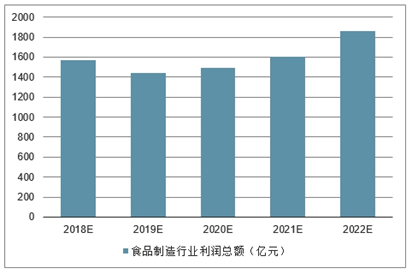 2018年我国食品制造行业利润总额将达到1,570亿元,未来五年(2018-2022)年均复合增长率约为4.33%,2022年将达到1,860亿元。