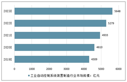 2019-2023年中国工业自动控制系统装置制造行业市场规模预测(单位:亿元)