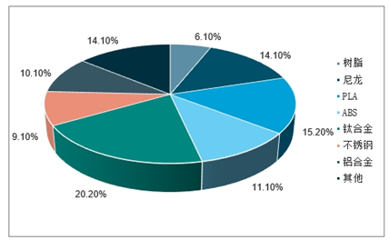 由于3D打印材料的下游应用主要为装备制造业,因此应用的3D打印材料主要为金属类材料,包括钛合金、铝合金、不锈钢及其他金属材料,金属类材料合计占比超过40%;另外,工程塑料ABS、尼龙、PLA等主流3D打印材料占比也在10%以上。