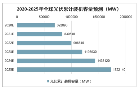 2011-2018年德国光伏累计装机容量维持稳定上升趋势,结合当前全球各国的可再生能源政策以及光伏发电补贴、上网政策综合分析,预计在未来的一段时间,全球光伏累计装机容量还将会继续保持增长,预计2025年将会达到1722140MW。