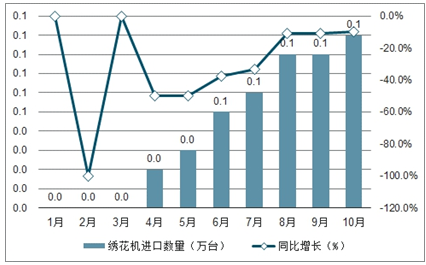 2019年1-10月中国绣花机累计进口数量及增速趋势图
