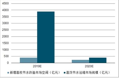 2019年高效节水灌溉市场将新增约0.2*2000=400亿元规模,到2022年,高效节水灌溉市场新增规模将到1.94*2000=3880亿元。此外,由于市场上滴带管使用寿命多在1-3年,其他节水设施也存在或多或少损耗,假设每亩高效节水灌溉农田每年维护经费为100元,则2019年、2022每年运维市场规模则可达2.26*100=226亿元、4*100=400亿元。