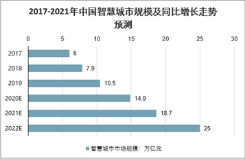 2018年中国智慧城市市场规模将达到7.9万亿元,到2021年将形成18.7万亿元的市场规模。并预测到2022年,我国智慧城市市场规模将达到25万亿元。