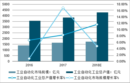 2016-2018年中国工业自动化市场规模、总产值及增长率
