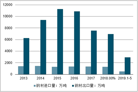 2018年我国出口钢材6934万吨,同比下降8.1%;2019年1-5月我国累计出口钢材2909万吨,同比增长2.5%。预计2019年中国钢材出口规模或有所下降。