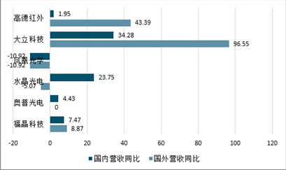 国内营收最高的是水晶光电,达到11.99亿元,其增长主要是由于手机双摄、多摄渗透率提升,产品数量增多;大立科技在国内和国外市场中的区域营收涨幅最大,分别为34.28%和96.55%,这主要得益于2018年军品订单持续恢复,民品订单保持同步高速增长;高德红外国内市场营收远超国外市场,抓住了传统军工业务恢复性增长契机。
