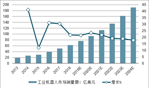 当前,我国生产制造智能化改造升级的需求日益凸显,工业机器人的市场需求依然旺盛,据统计,2018年我国工业机器人销量额达62.3亿美元,预测2024年销量额将超过190亿美元。