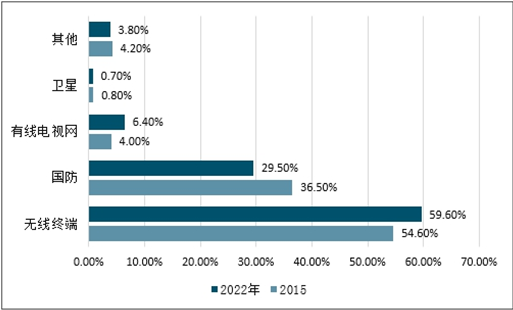 2015、2022年氮化镓射频器件市场应用领域占比情况